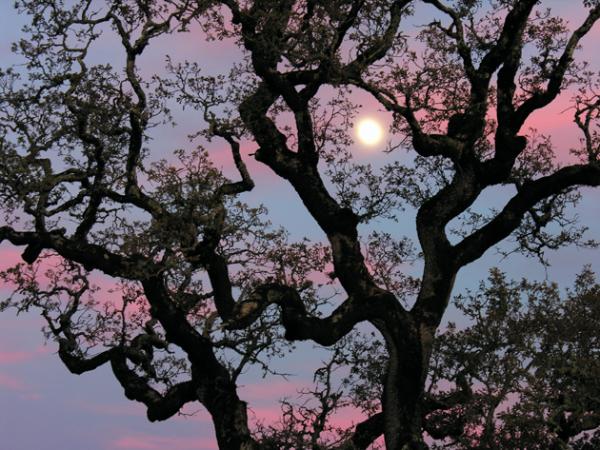 A winter moon framed through the limbs of an ancient oak tree at Monte Bello